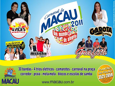 O Carnaval de Macau será lançado hoje pelo colunista Toinho Silveira no restaurante Moinhos do Hotel Thermas. A cidade litorânea de Macau já é tradicionalmente conhecida por realizar um dos maiores carnavais do Rio Grande do Norte. Esse ano não será diferente, 04 trios elétricos, camarotes, arrastões e mela-mela são apenas alguns dos atrativos do carnaval dessa bela cidade.
