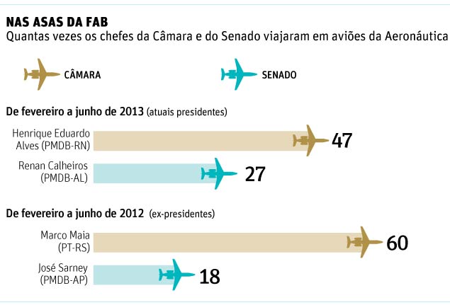 O presidente do Senado, Renan Calheiros (PMDB-AL), solicitou 27 voos desde que assumiu, em fevereiro, até junho. Além de Alagoas, seu reduto político, foi ao Rio, São Paulo, Ceará e Bahia. O antecessor de Renan, José Sarney (PMDB-AP), voou 18 vezes no mesmo período de 2012.