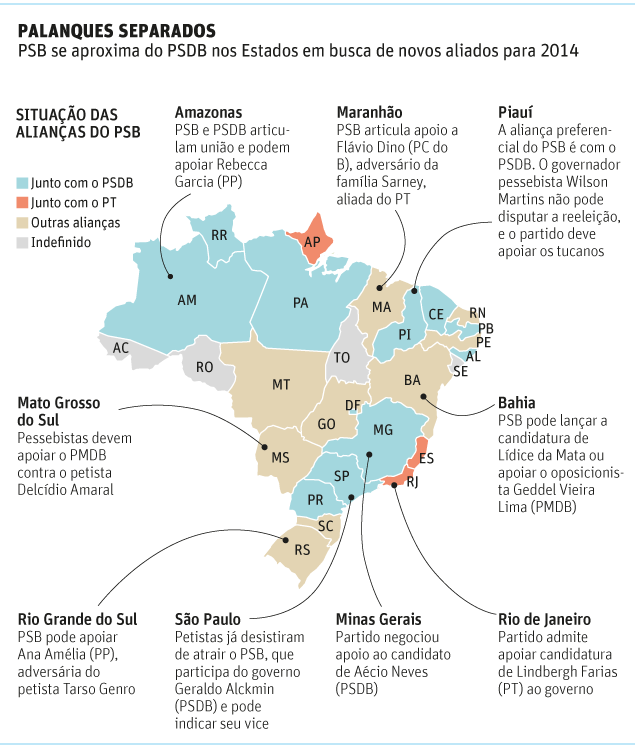 O partido está próximo do PSDB em Estados de grande eleitorado, como São Paulo e Minas Gerais. No Rio Grande do Sul, praça também estratégica, rompeu com o governo do petista Tarso Genro e pode trocar a aliança histórica com o PT pelo apoio à senadora Ana Amélia, do PP.