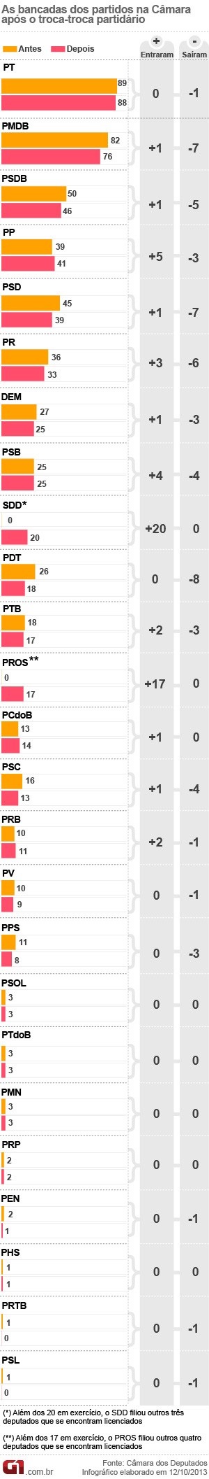 O troca-troca partidário das últimas semanas (clique na imagem ao lado ou aqui para ver as mudanças) quase não alterou posições na lista dos partidos com mais deputados na Câmara, mas provocou o encolhimento das bancadas de siglas tradicionais e levou pelo menos duas legendas a ficar sem representantes no Legislativo. Dos 59 deputados que trocaram de partido desde 1º de setembro (11,5% do total de 513), segundo levantamento do G1 com base em dados da Câmara, 37 migraram para os recém-criados Partido Republicano da Ordem Social (PROS) e Solidariedade (SDD). Além disso, essas duas siglas atraíram sete deputados licenciados (que atualmente não estão exercendo o mandato).