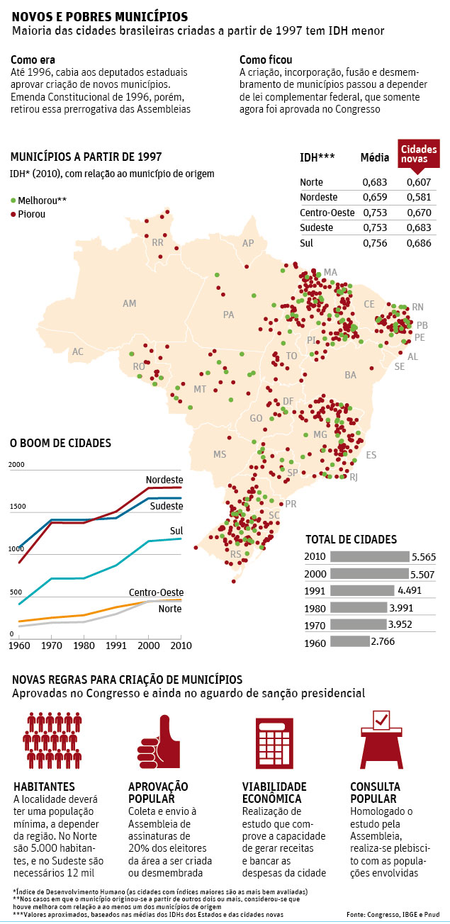 Levantamento feito pela Folha com auxílio do IBGE mostra que a maioria dos 595 municípios brasileiros criados desde 1997 nasceu com baixa qualidade de vida e até hoje se mantém abaixo da média dos Estados.