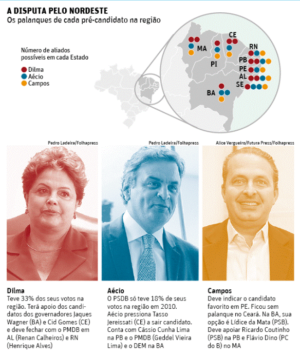 Aécio Neves (PSDB-MG) deverá contar com nomes aliados nos nove Estados, mas os tucanos enfrentam dificuldades para montar palanques sólidos nos maiores eleitorados.É nesse eixo que Dilma aposta suas fichas. Ela terá aliados tidos como competitivos na Bahia (26% do eleitorado da região), Pernambuco (17%) e Ceará (16%).