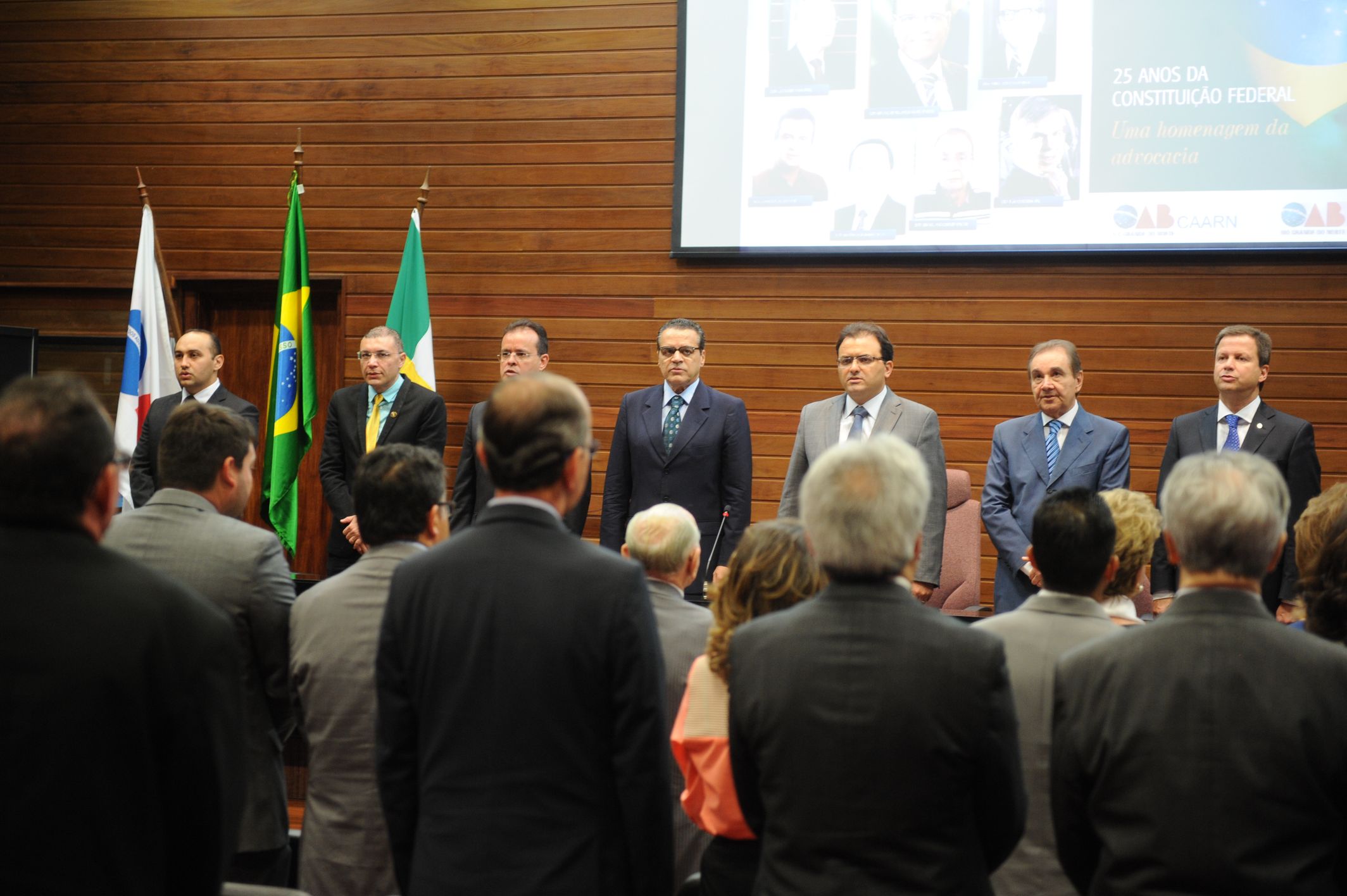 Marcus Vinícius disse que os constituintes potiguares foram decisivos “para que tivéssemos nesses 25 anos de estabilidade democrática em nosso país, o mais longo período de normalidade política das instituições brasileiras”. O presidente da OAB ainda lembrou a importância da atividade política para a democracia. “O discurso que desqualifica a atividade política é repudiado pela OAB, pois vem em desfavor da prática democrática”, afirmou Marcus Vinicius. Ele também elogiou a atual gestão da Câmara dos Deputados, reconhecendo o esforço de Henrique Alves pelo restabelecimento de prerrogativas do Poder Legislativo, como o orçamento impositivo, classificado por ele como “uma carta de alforria do Congresso”. Iniciativas como essa, segundo ele, têm todo o apoio do Conselho Nacional da OAB.