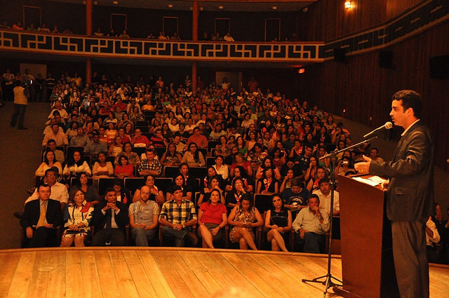 Com o Teatro Municipal Dix-Huit Rosado lotado, o prefeito Francisco José Júnior e a secretária municipal da Educação, Ieda Maria Chaves, fizeram, na noite desta quarta-feira, 22, a abertura do ano letivo da rede municipal de ensino. Na oportunidade, o Professor Mestre Nélio Spréa da Universidade Federal do Paraná proferiu a palestra “Da sola do pé ao pé da letra”, para mais de 500 professores presentes, que também deu início a Semana Pedagógica 2014.