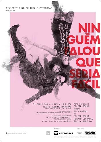 Esta semana Natal vai receber a peça teatral “Ninguém Falou que Seria Fácil”. Os atores Felipe Rocha, Renato Linhares e Stella Rabello estarão no Teatro Alberto Maranhão, em três sessões gratuitas, nos dias 31 de janeiro (sexta-feira) às 20h, e 01 de fevereiro (sábado), às 18h e 20h. Os ingressos podem ser retirados na bilheteria do TAM com uma hora de antecedência ao espetáculo. Além das apresentações, na sexta (31), após a peça, o grupo fará um bate-papo e no sábado (01/02), às 10h, ministrarão uma oficina gratuita.
