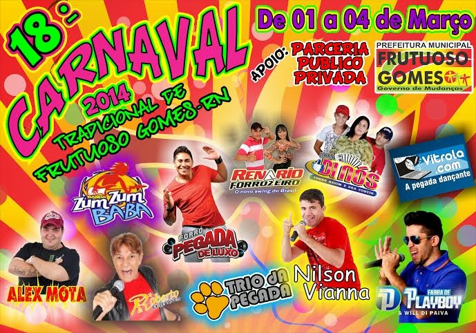 Em virtude dos problemas da estiagem e o estado de calamidade em que os municípios se encontram, o carnaval será realizado por parceiros públicos privados com total apoio na parte estrutural, segurança e limpeza da prefeitura de Frutuoso Gomes/RN.