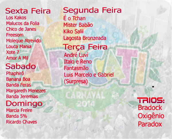 Ao todo, 23 bandas e artistas se apresentarão, em Aracati, no corredor da Folia, durante o carnaval 2014. Veja programação oficial do maior carnaval do Ceará.