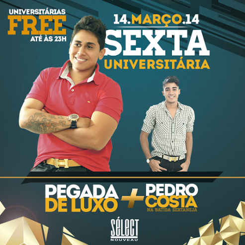 Sélect Nouveau. Na sexta-feira (14) a casa abre as portas para receber a Sexta Universitária com o forró da banda Pegada de Luxo mais Pedro Costa na Batida Sertaneja. As universitárias têm entrada free até às 23h.