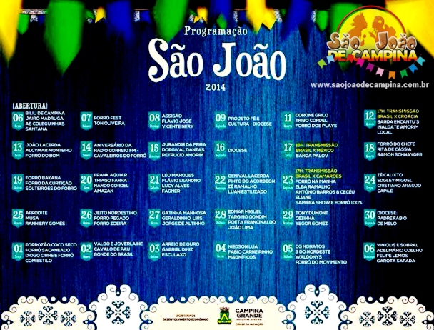Foi divulgada na manhã desta segunda-feira (19). De acordo com a Prefeitura Municipal, a festa pretende atrair cerca de duas milhões e quinhentas mil pessoas à cidade entre os dias 6 de junho a 6 de julho. Além do calendário principal no Parque do Povo, a festa contará com eventos nos distritos de Galante e São José da Mata, nas casas de shows e clubes do município além de festas juninas nos bairros.