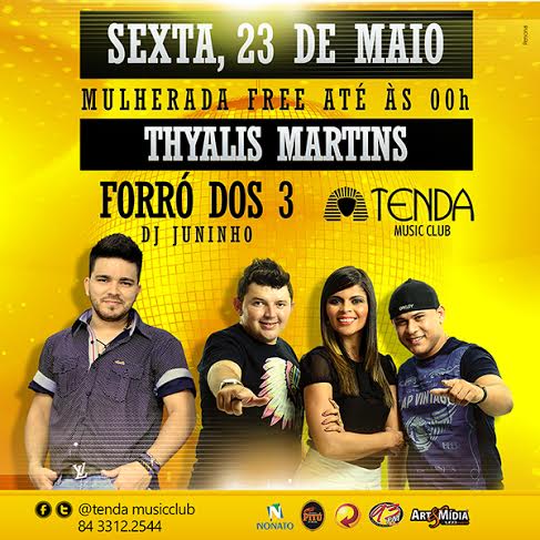 Nessa sexta-feira (23) o Tenda Music Club recebe os agitos do cantor Thyalis Martins com os grandes sucessos do sertanejo universitário. A festa conta ainda com o arrasta pé da banda mossoroense Forró dos 3 e os hits eletrônicos do Dj Juninho.