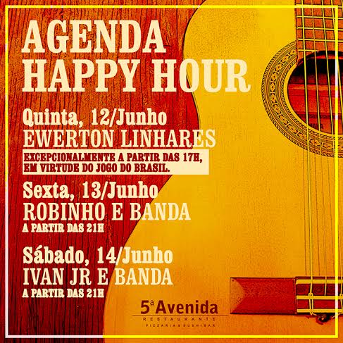 A programação musical dessa semana no 5ª Avenida Restaurante começa mais cedo na próxima quinta-feira, dia 12, a partir das 17h com os agitos de Ewerton Linhares. O cantor anima o ambiente que estará no ritmo de Copa para exibição da estreia do Brasil no Mundial 2014. Na sexta (13), a partir das 21h, o palco é invadido pelo repertório de sucessos de Robinho e Banda.