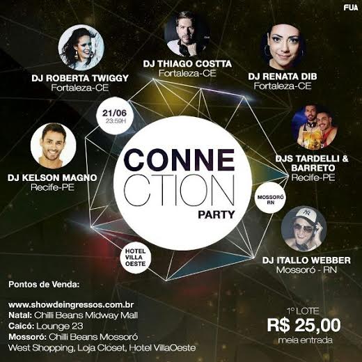O VillaOeste será palco da grande festa que conectará os amantes da música eletrônica, a Connection Party. O evento reunirá os melhores DJs do Rio Grande do Norte, Pernambuco e Ceará, e será realizado no dia 21 de Junho, às 23h59min, no Espaço Villa. O encontro será em grande estilo, onde sete DJs revezarão o comando da pista para celebrar o mês mais amado pelos mossoroenses e os turistas.