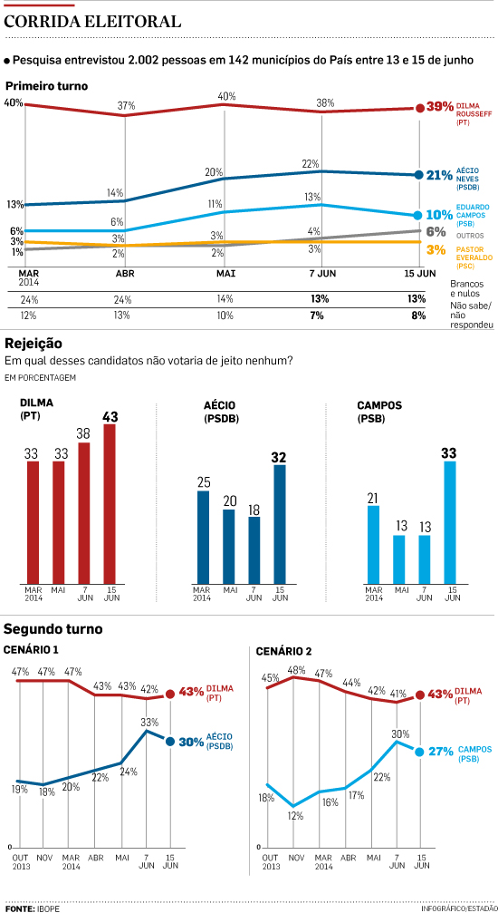 Ainda de acordo com a pesquisa, a taxa de rejeição dos três principais presidenciáveis aumentou. A de Dilma subiu de 38% para 43%, a de Aécio foi de 18% para 32% e a de Campos, de 13% para 33%.