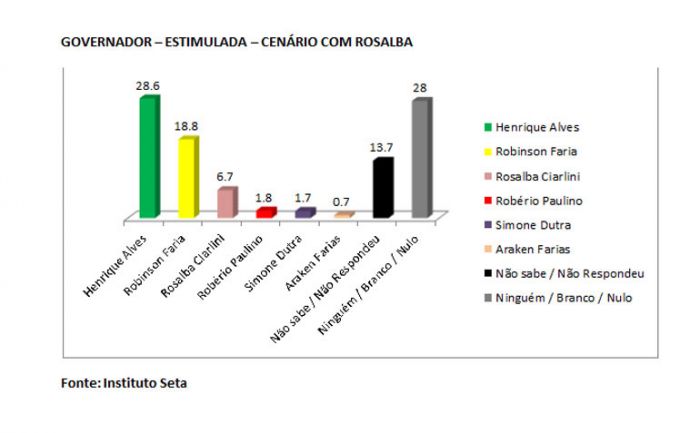 O Instituto Seta fez a pergunta sem a presença da governadora Rosalba Ciarlini no páreo da eleição para o governo. O resultado é o seguinte: Henrique Alves aparece com 30,3% das intenções de voto e Robinson Farias com 20,2%, uma diferença de quase dez pontos percentuais.