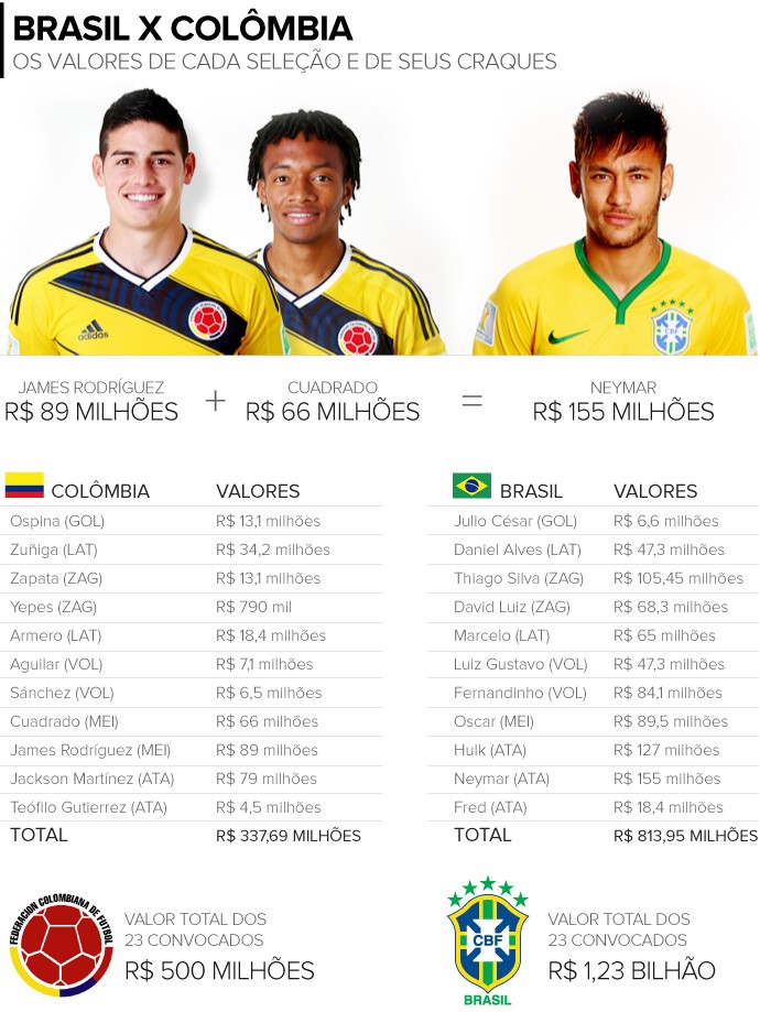Para se ter uma ideia, Neymar, que é avaliado em € 52 milhões (R$ 155 milhões), vale exatamente o mesmo que James Rodriguez e Cuadrado, as duas estrelas de maior destaque do elenco cafetero, juntos. O camisa 10, que é o artilheiro da Copa, é avaliado em € 30 milhões (R$ 89 milhões), enquanto o meio-campista, que é cobiçado por grandes times do futebol europeu, vale € 22 milhões (R$ 66 milhões).