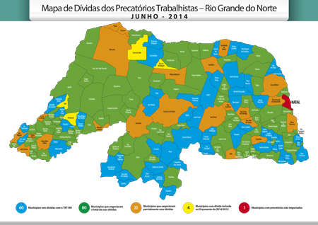 A peça foi criada para demonstrar, de forma didática e direta, a situação dos municípios do Rio Grande do Norte em relação ao pagamento de seus precatórios e Requisições de Pequeno Valor (RPV).O Mapa identifica a situação do município referente ao pagamento de seus precatórios com cinco cores: vermelho, laranja, amarelo, verde e azul.
