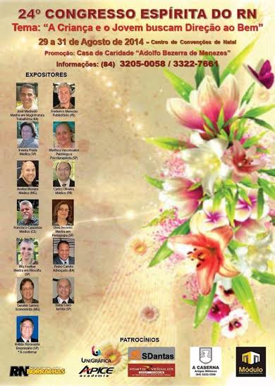 O Congresso Espírita do Rio Grande do Norte – CONGERN será realizado de período de 29 de agosto a 01 de setembro de 2014, no Centro de Convenções de Natal, e terá como tema central: “ A criança e o jovem buscam direção ao bem”.