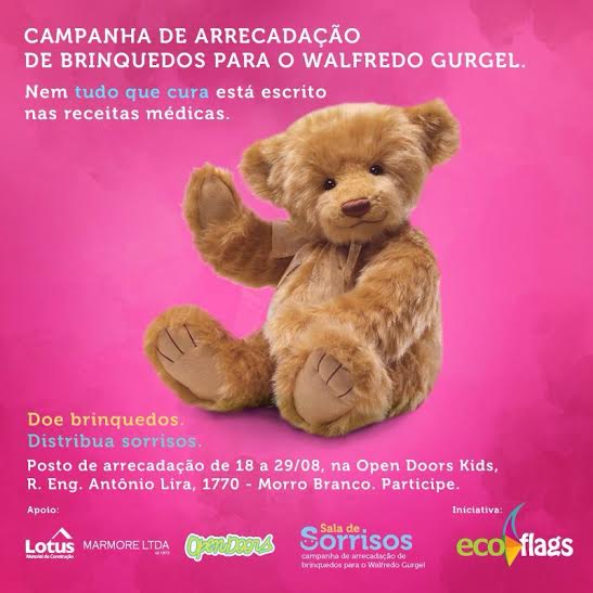 A campanha de arrecadação de brinquedos para ajudar as crianças atendidas no Centro de Tratamento de Queimados (CTQ) do Hospital Walfredo Gurgel (HWG) segue até sexta-feira (29). A iniciativa faz parte da parceria entre a Escola de Inglês Open Doors e a Eco Flags Natal. As doações podem ser feitas na unidade Kids da escola Open Doors, localizada na Rua Engenheiro Antônio Lira, 1770, no bairro Morro Branco, em Natal.