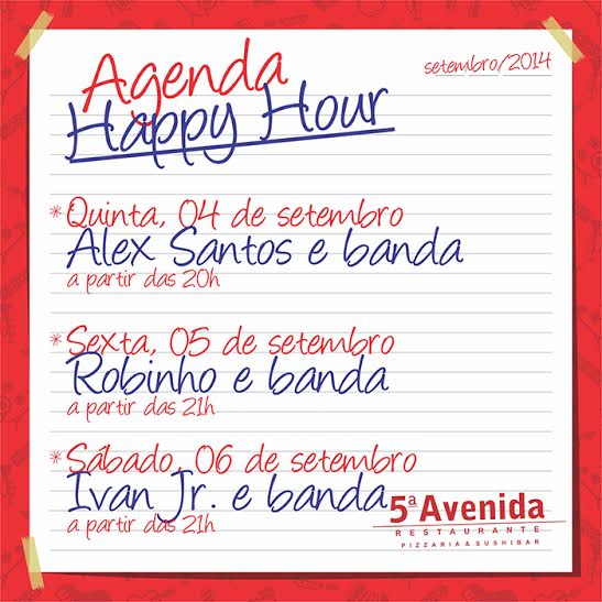 Nesta quinta(04) a programação começa com Alex Santos e banda. Robinho, com a sua voz poderosa e presença de palco, é a atração da sexta (05). O Cantor Ivan Jr. e sua banda são as atrações que encerram a programação musical da semana no 5ª Avenida no sábado(06).