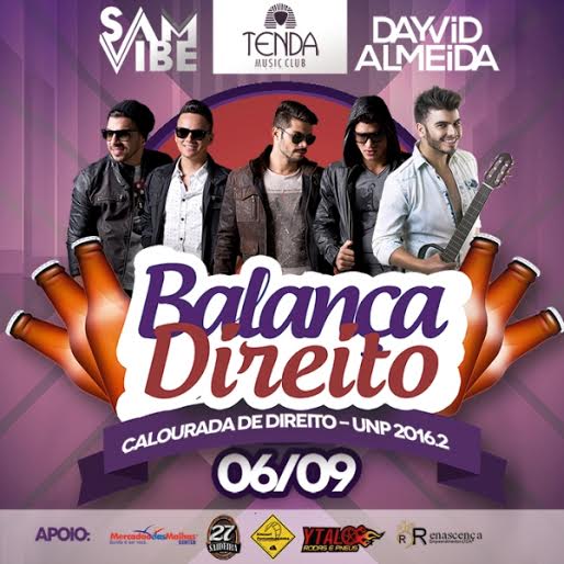 A Calourada da turma de Direito – UnP 2016.2 acontece no próximo sábado, dia 06, no Tenda Music Club. A festa intitulada “Balança Direito” contará com a animação da banda natalense Sam Vibe, que traz uma mistura boa de música eletrônica, samba e pop.