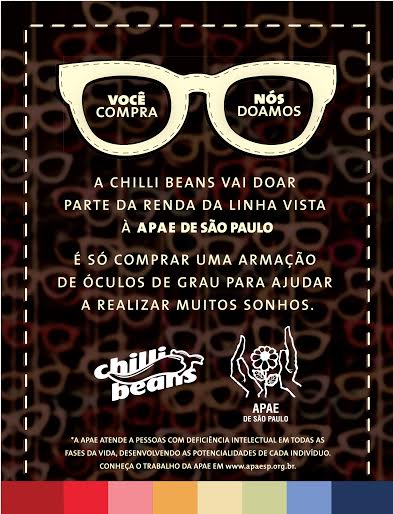 Para completar, os clientes da Chilli Beans de São Paulo podem doar o valor da nota fiscal paulista à APAE de São Paulo. Os óculos já estão sendo comercializados nas lojas Chilli Beans.