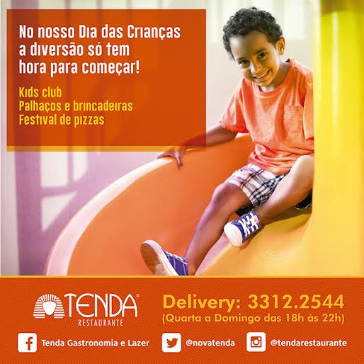 O Tenda Gastronomia e Lazer já programou um Dia das Crianças diferenciado para o próximo dia 12 de outubro. Além de uma gastronomia excelente com pratos que sempre agradam aos pequenos, o Tenda promoverá muita diversão para a criançada, a partir das 18h, com kids club, palhaços, brincadeiras e festival de pizza.