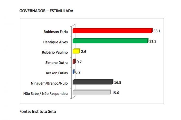 A pesquisa do Instituto Seta/Nominuto aponta que o candidato do PSD ao Governo Robinson Faria está na frente com 33,1% das intenções de votos contra o segundo colocado do PMDB Henrique Alves que tem 31,3%. Robério Paulino (PSOL) tem 2,6% das preferências.Simone Dutra (PSTU) e Araken Farias (PSL) não pontuaram. Ela tem 0,7% e ele, 0,2%. Brancos e nulos somam 16,5%, e indecisos (não sabe) totalizam 15,6%.