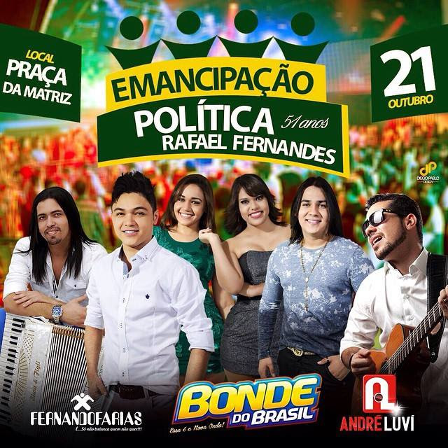 Para comemorar os 51 anos de emancipação política da cidade de Rafael Fernandes, a administração do Prefeito, Nicó Júnior, preparou um grande evento para marcar esta data na história do Município.A Semana Cultural e Artística de Rafael Fernandes – SECARF 2014, terá o seu ponto alto com uma grande festa em praça pública, com as bandas Bonde do Brasil, Fernando Farias e André Luvi.