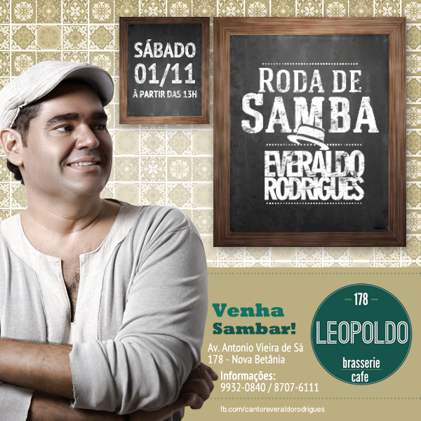 Neste sábado, dia 01 de novembro, às 13h, Everaldo Rodrigues estará apresentando a sua Roda de Samba, um evento que reunirá algumas participações especiais. A apresentação acontecerá na inauguração da casa Leopoldo Brasserie Café, um novo espaço localizado na av. Antônio Vieira de Sá, 178, Nova Betânia.
