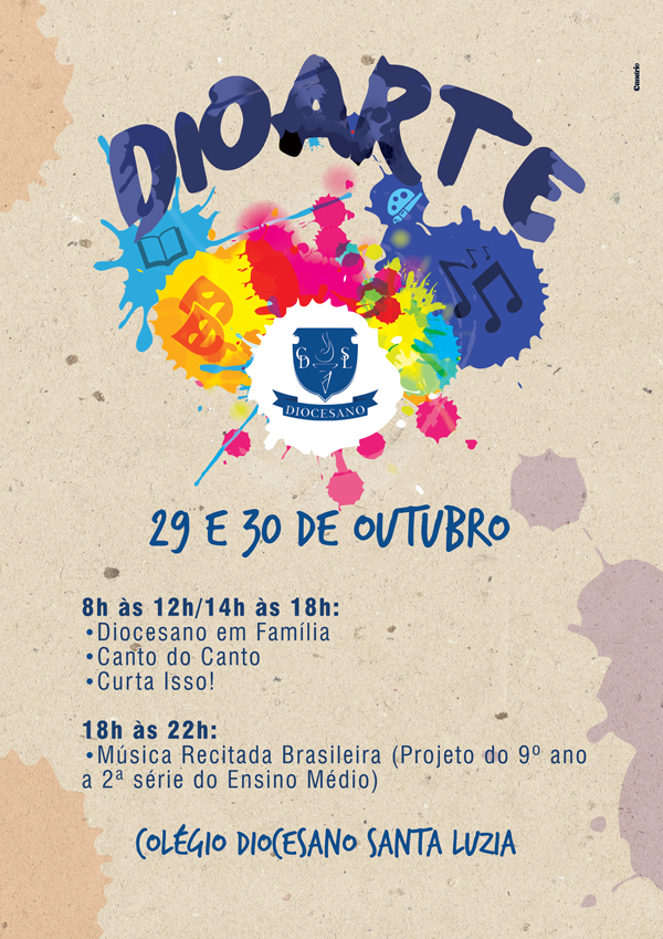 O evento se iniciará com a DIOARTE – Mostra Cultural de Artes do Diocesano, nos dias 29 e 30 de outubro, nas dependências do colégio. Com o tema Música Recitada Brasileira, a iniciativa oportuniza a apresentação dos trabalhos para a comunidade escolar, através de diversas expressões artísticas, como a leitura de obras literárias, recital de poemas, exposição de pinturas de fotografias, música e exibição de curtas-metragens produzidos pelos educandos.