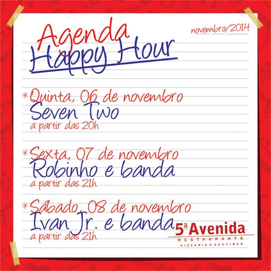 A excelente gastronomia aliada à boa música ao vivo dos artistas locais é uma receita que vem dando certo e agradando o público nas noites do 5ª Avenida Restaurante. A agenda musical dessa semana no ambiente tem início na próxima quinta-feira (06), a partir das 20h, com o pop rock da banda Seven Two.