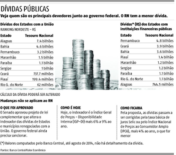 A Tribuna do Norte destaca que o Rio Grande do Norte é, entre os Estados do Nordeste, aquele com o menor débito junto ao Governo Federal. A dívida pública do Estado é de R$ 62 milhões com o Tesouro Nacional. Somado aos R$ 1.145 bilhão em dívida com instituições financeiras públicas, a conta salta para R$ 1,207 bilhão. Os dados são referentes ao mês de agosto de 2014, e compõem a Dívida contratual interna junto ao Tesouro Nacional e ao Sistema Financeiro Nacional, divulgados pelo Banco Central.