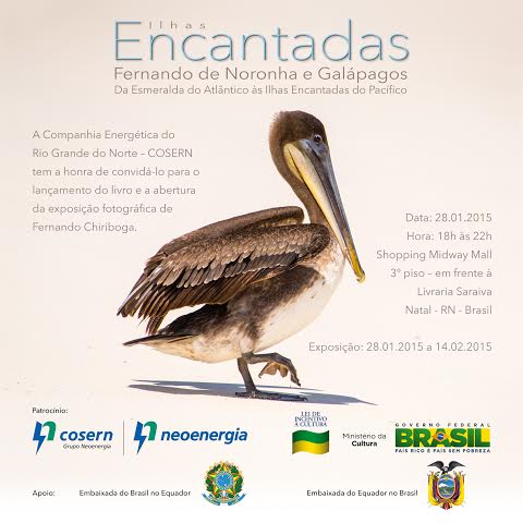 Ilhas, praias paradisíacas, baías encantadoras, aves, peixes e mamíferos de várias espécies raras. Cenários dos dois arquipélagos da América do Sul que são declarados Patrimônio Nacional da Humanidade pela UNESCO e que o fotógrafo Fernando Chiriboga fez questão de fotografar e registrar no seu mais novo livro que será lançado no próximo dia 28 de janeiro, a partir das 18h, em frente à livraria Saraiva do Midway Mall, com o título: “Ilhas Encantadas – Fernando de Noronha e Galápagos”.O livro, patrocinado pela Cosern – Grupo Neoenergia, através da Lei Rouanet de incentivo a cultura, do Ministério da Cultura, reúne mais de 350 fotos em 270 páginas, com fotografias e textos traduzidos em três línguas.