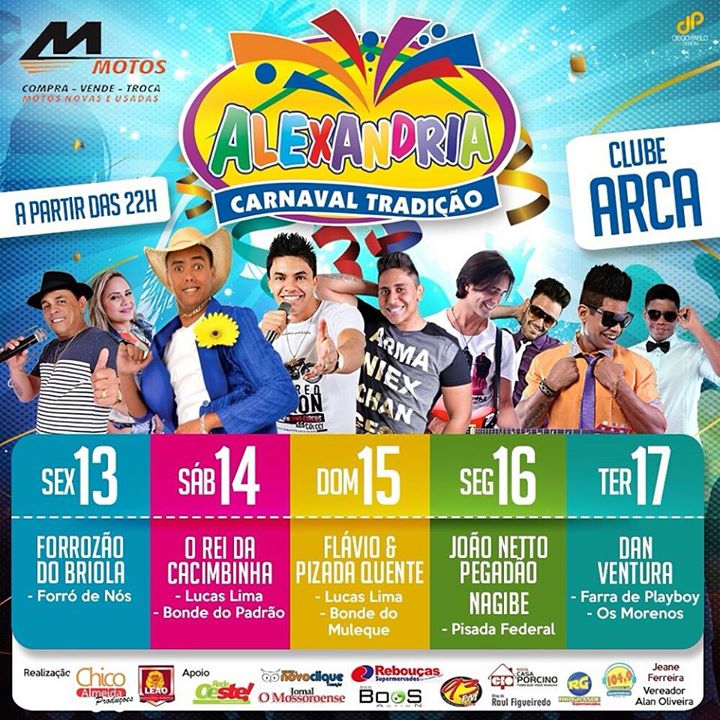 Veja as atrações de mais um carnaval do RN, aqui programação do carnaval de Alexandria / RN. O Carnaval de Alexandria é um evento privado realizado no Clube Arca