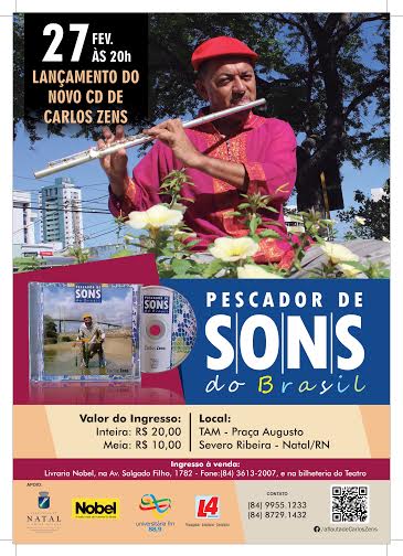 O compositor, flautista e cantor potiguar Carlos Zens lança seu novo CD “Pescador de Sons” na próxima quinta-feira, dia 27 de fevereiro, às 20h, no Teatro Alberto Maranhão, em Natal. O novo CD chega carregado de alegrias, com Carlos Zens interpretando clássicos da música popular potiguar brasileira e da música universal, numa diversidade de ritmos inspirados em sua profunda contemplação com as raízes e matizes do nosso povo. Dezessete faixas formam o repertório do CD com músicas autorais, de outros compositores potiguares e grandes mestres da música brasileira e universal, fazendo releituras, criativas de grandes obras como: Tema da 5ª Sinfonia / Ciranda do Sossego (Beethoven e Carlos Zens), Calango da Praia / Araruna (Carlos Zens/ Domínio Público), “Um ponto em baixo, um ponto em cima” (Tico da Costa), entre outras.