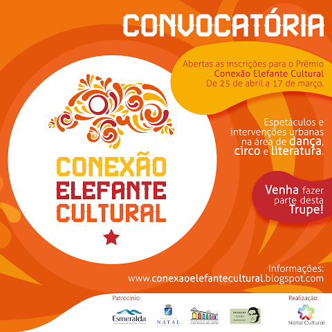 Para os amantes da cultura uma boa notícia. A Natal Cultural lança convocatória do Conexão Elefante Cultural para espetáculos ou intervenções na área de dança, circo e literatura a compor a “Trupe do Elefante” em ação pelas 04 zonas da cidade do Natal, além de Ceará-Mirim, Macaíba, Parnamirim e São Gonçalo do Amarante.