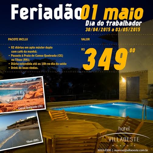 Mais um feriadão aproxima-se e o Hotel VillaOeste já programou um pacote especial para os seus hóspedes. O pacote que homenageia o Dia do Trabalhador, comemorado no dia 01 do próximo mês, é válido para o período de 30 de abril a 03 de maio, com diárias em apartamento máster duplo e café da manhã, drink de boas vindas, passeio por Canoa Quebrada (CE) ou Tibau (RN), e diária estendida até às 18h no dia da saída.