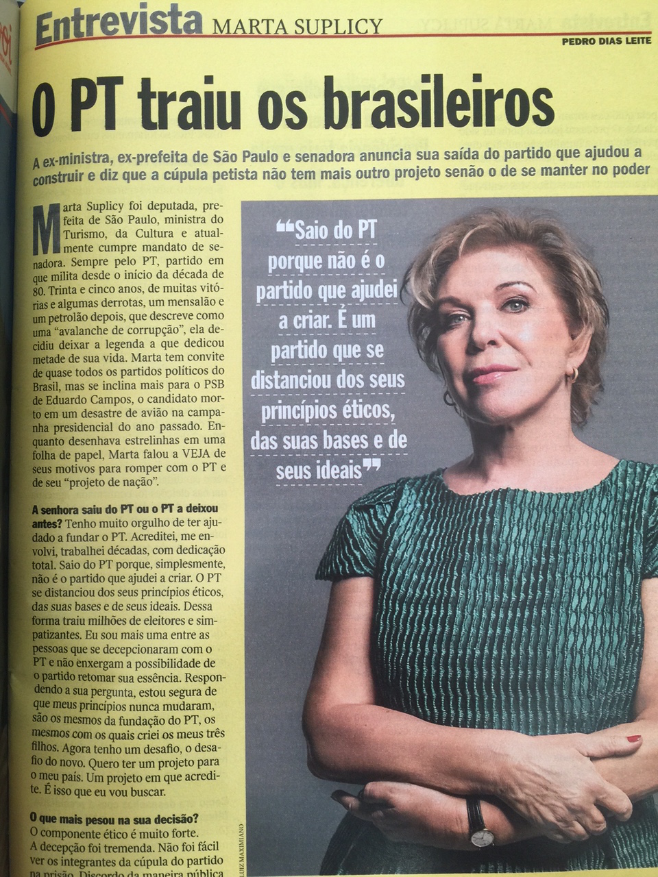A senadora Marta Suplicy formaliza nesta terça-feira sua desfiliação do PT depois de 33 anos. Na carta em que justifica a saída Marta diz: “No meu sentir, e de toda a nação, os princípios e o programa partidário do PT nunca foram tão renegados pela própria agremiação, de forma reiterada e persistente”.