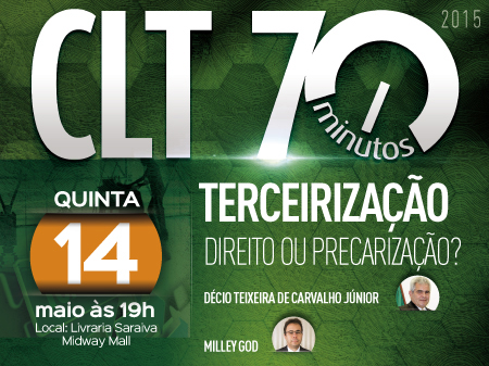 O próximo encontro do projeto CLT 70 Minutos vai discutir os impactos das mudanças aprovadas pela Câmara dos Deputados nas regras da Terceirização no Brasil. O evento será realizado na próxima quinta-feira (14), a partir das 19h, no auditório da livraria Saraiva do Midway Mall.