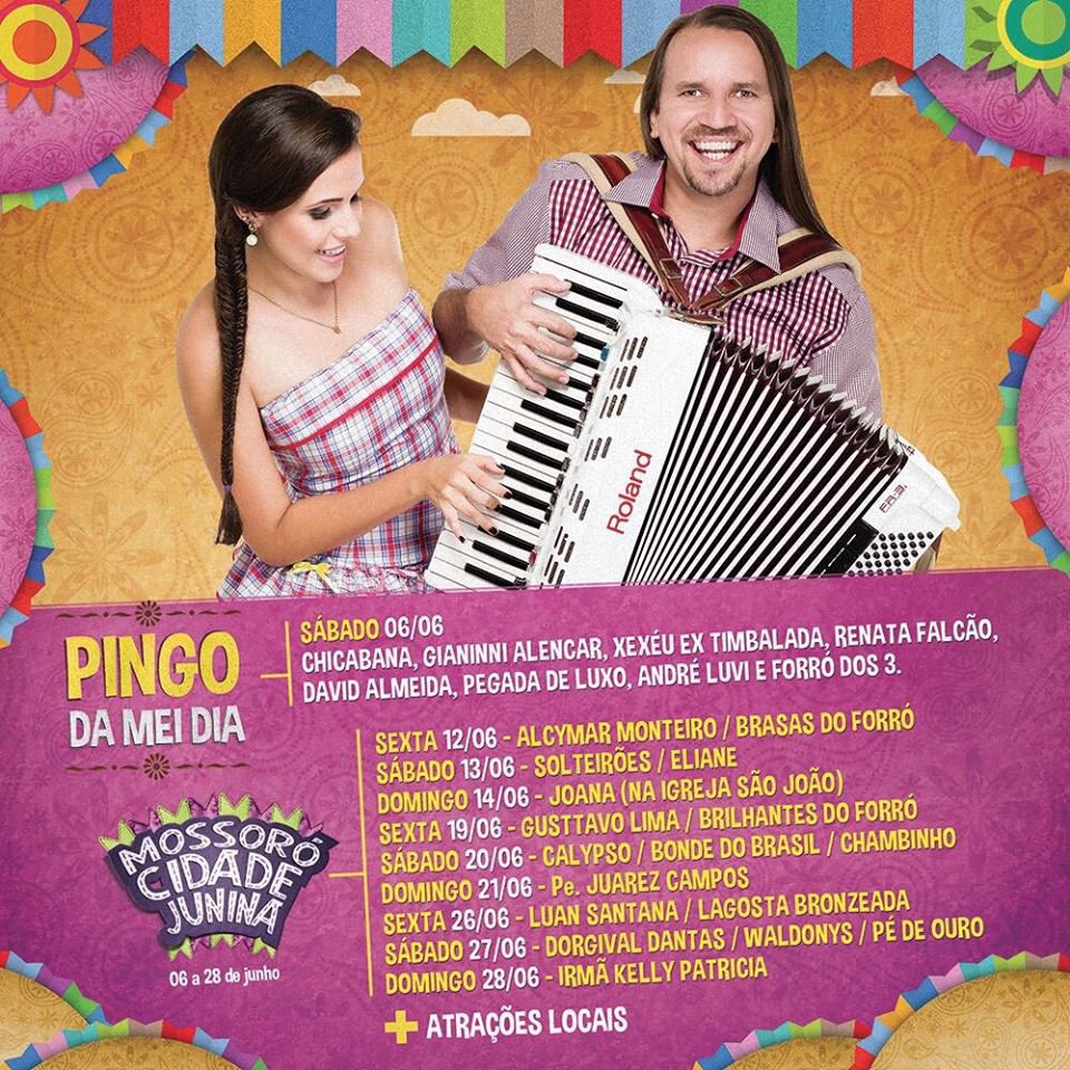 O Pingo da Mei-Dia conta com quadrilhas, comboios, pau de arara elétrico, trios, comidas típicas, concursos de trajes juninos, além de apresentações de bandas de forró que fazem a alegria dos presentes. O evento acontecerá dia 06/junho e contará este ano com apresentações dos sanfoneiros CHICABANA E XEXÉU como atrações principais que se apresentarão no famoso trio elétrico Brocoió e mais 2 trios . E atrações locais : Pegada de Luxo, Giannini Alencar,André Luvi , Renata Falcão, David Almeida,Forró dos 3 . E não para por aí: haverá forró pé de serra e dois paus de araras eletrônicos ao longo de todo o corredor cultural.
