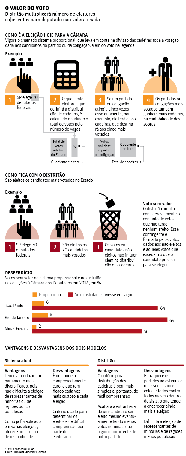 Principal bandeira do PMDB na reforma política, o sistema de eleição para deputado conhecido como distritão torna sem efeito a maior parte dos votos dados pelos eleitores aos candidatos.No atual modelo, o voto sem serventia atingiu 6% dos eleitores de São Paulo que escolheram um candidato a deputado em 2014. Com o distritão, atingiria 64%. As informações são da Folha de São Paulo.