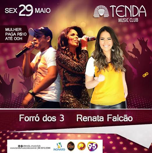 A noite da próxima sexta-feira, 29, será de muitos agitos na pista de dança do Tenda Music Club, que traz o ritmo irreverente e descontraído da cantora mossoroense Renata Falcão para animar o público. A festa, que começa às 23h não tem hora para acabar, terá também a participação da banda Forró dos 3, com muito arrasta pé, e Dj Juninho com os hits eletrônicos do momento.