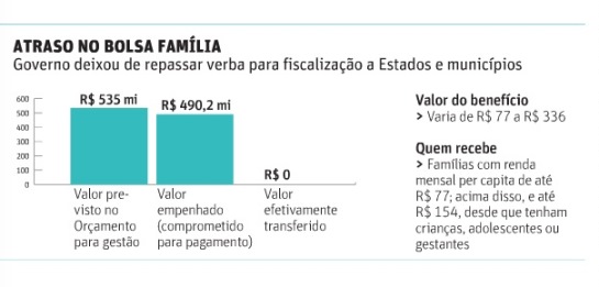 Neste ano, a ação “Serviço de apoio à gestão descentralizada do programa Bolsa Família” tem previsão orçamentária de R$ 535 milhões. Segundo a ONG Contas Abertas, R$ 490,2 milhões chegaram a ser comprometidos para pagamento posterior. Mas nada foi transferido. As prefeituras dizem que os atrasos afetam outros programas, como os Cras e Creas (centros de assistência social).