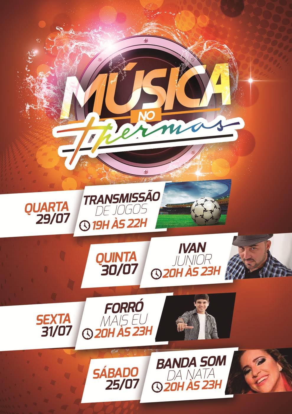 Os mossoroenses e hóspedes do Hotel Thermas contam com um espaço ideal para relaxar todos os dias. A receita do relaxamento é o planeta água, o parque aquático do Thermas. Especialmente a partir das quintas-feiras às 20h, é possível curtir apresentações de música ao vivo com os talentos da terra no bar da piscina e no palco da piscina.Nesta semana a música ao vivo começa na quinta-feira(30) com Ivan Júnior. Na sexta-feira(31) é a vez da Banda “Forró Mais Eu” com o legítimo forró pé de serra. No sábado(01) tem a banda “Som da Nata” dando boas vindas ao mês de agosto no palco da piscina.