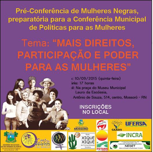 O intuito é impulsionar o debate e a construção de propostas em eixos que assegurem a igualdade de gênero e os direitos de todas as mulheres em sua diversidade e especificidades: Contribuição dos Conselhos dos Direitos da Mulher e dos Movimentos Feministas e de mulheres para a efetivação da igualdade de direitos e oportunidades; Estruturas Institucionais e Políticas Públicas desenvolvidas para mulheres no âmbito municipal, estadual e federal: avanços e desafios; Sistema Político com participação das mulheres e igualdade e Sistema nacional de política para as mulheres.Após a discussão e elaboração de propostas, será feita a eleição de delegadas que representarão o segmento de mulheres negras, na Conferência Municipal de Políticas para as Mulheres, que acontecerá em Mossoró, entre 18 a 24 de setembro.O evento antecede a Conferência Municipal prevista para os dias de 18 a 24 de setembro, a Estadual, que será realizada entre os dias 25 e 27 de novembro; e a IV Conferência Nacional, que será realizada entre os dias 15 e 18 de março de 2016.