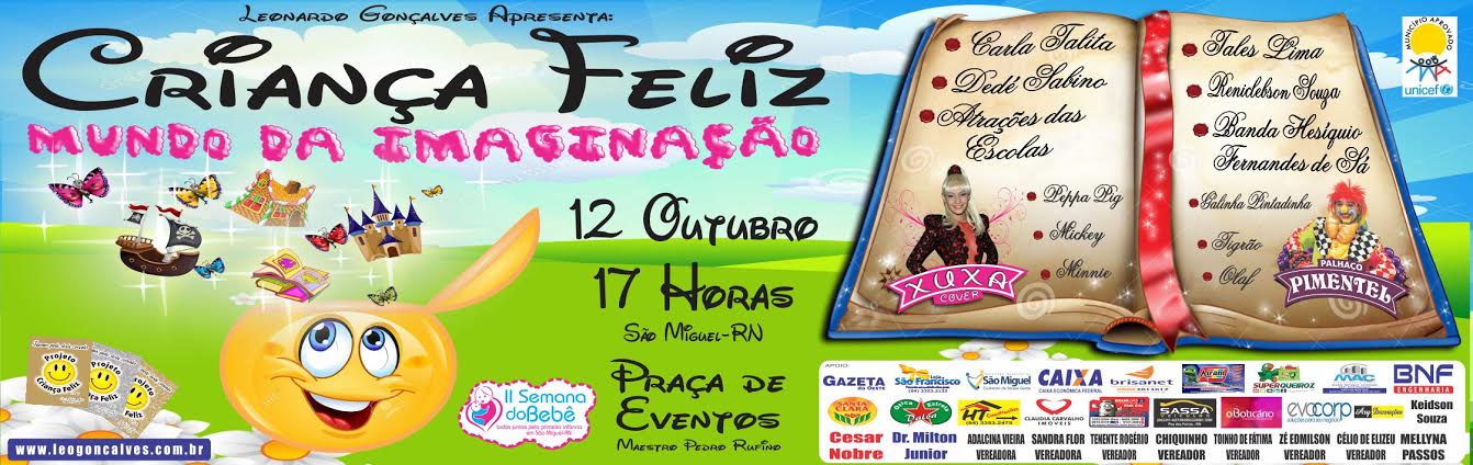 A 8ª edição do Projeto Criança Feliz com o tema Mundo da Imaginação será na Praça de Eventos Maestro Pedro Rufino com um grande show beneficente no dia 12 de Outubro, dia das crianças a partir das 5hs da tarde, onde a população fará doações de alimentos. As três escolas que mais arrecadarem doações receberão placas de Ouro, Prata e Bronze. Teremos atrações das escolas, Banda Hesíquio Fernandes de Sá, Xuxa Cover, Palhaço Pimentel,