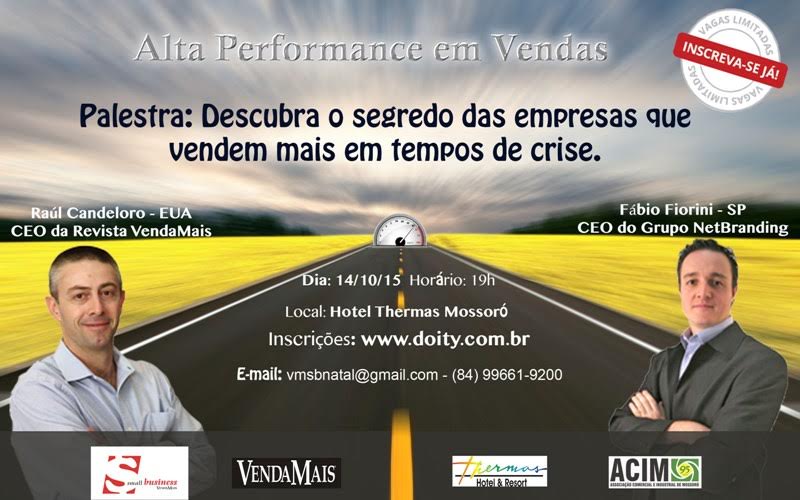 Alta Performance em Vendas é tema da palestra promovida pela ACIM em parceria com a “Venda Mais Small Businesse”, nessa quarta-feira (14). O encontro que acontece no Hotel Thermas, às 19h, contará com a participação dos renomados Raúl Candeloro (EUA) e Fábio Fiorini (SP), que ministrarão a palestra “Descubra o segredo das empresas que vendem mais em tempos de crise”. A programação abordará temas relacionados à liderança de mercados de vendas, recrutar equipes de alto desempenho, pós-vendas e outros.