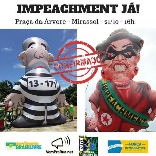 Na próxima quarta-feira, 21 de outubro, haverá mais um movimento pelo impeachment da presidente Dilma Rousseff. O manifesto ocorrerá em várias cidades brasileiras, e em Natal será na Praça da Árvore, em Mirassol, a partir da 16h até a noite. Na local estarão os bonecos gigantes da presidente Dilma, a Bandilma, e do ex-presidente Lula, o Pixuleco.