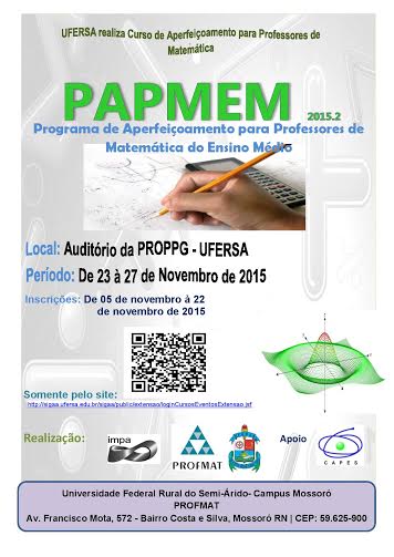 Estudantes universitários e professores de matemática da rede pública de ensino poderão participar a partir da próxima segunda-feira, 23, na Universidade Federal Rural do Semi-Árido, do Programa de Aperfeiçoamento de Professores da Educação Básica em Matemática, o PAPMEM 2015. A capacitação, que prosseguirá até a sexta-feira, 27, vai acontecer no Auditório da Pró-Reitoria de Pesquisa e Pós-Graduação, localizado no Campus Leste da Ufersa Mossoró. O aperfeiçoamento dará direito a certificado.