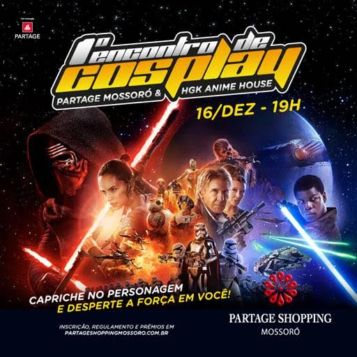 O Partage Shopping Mossoró e a HGK Anime House realizam o primeiro encontro de Cosplays no Partage Mossoró, com desfile competitivo no dia 16 de dezembro, às 19h antes da estreia no Multicine, do tão aguardado filme ‘STAR WARS – Episódio VII – O Despertar da Força’ e contará com premiações para os 03 (três) primeiros classificados nas categorias Infanto-juvenil (6 a 13 anos de idade) e Juvenil-adulto (a partir dos 14 anos).